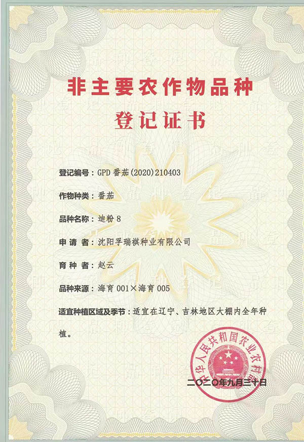 孚瑞祺种业2020年新品种登记证书